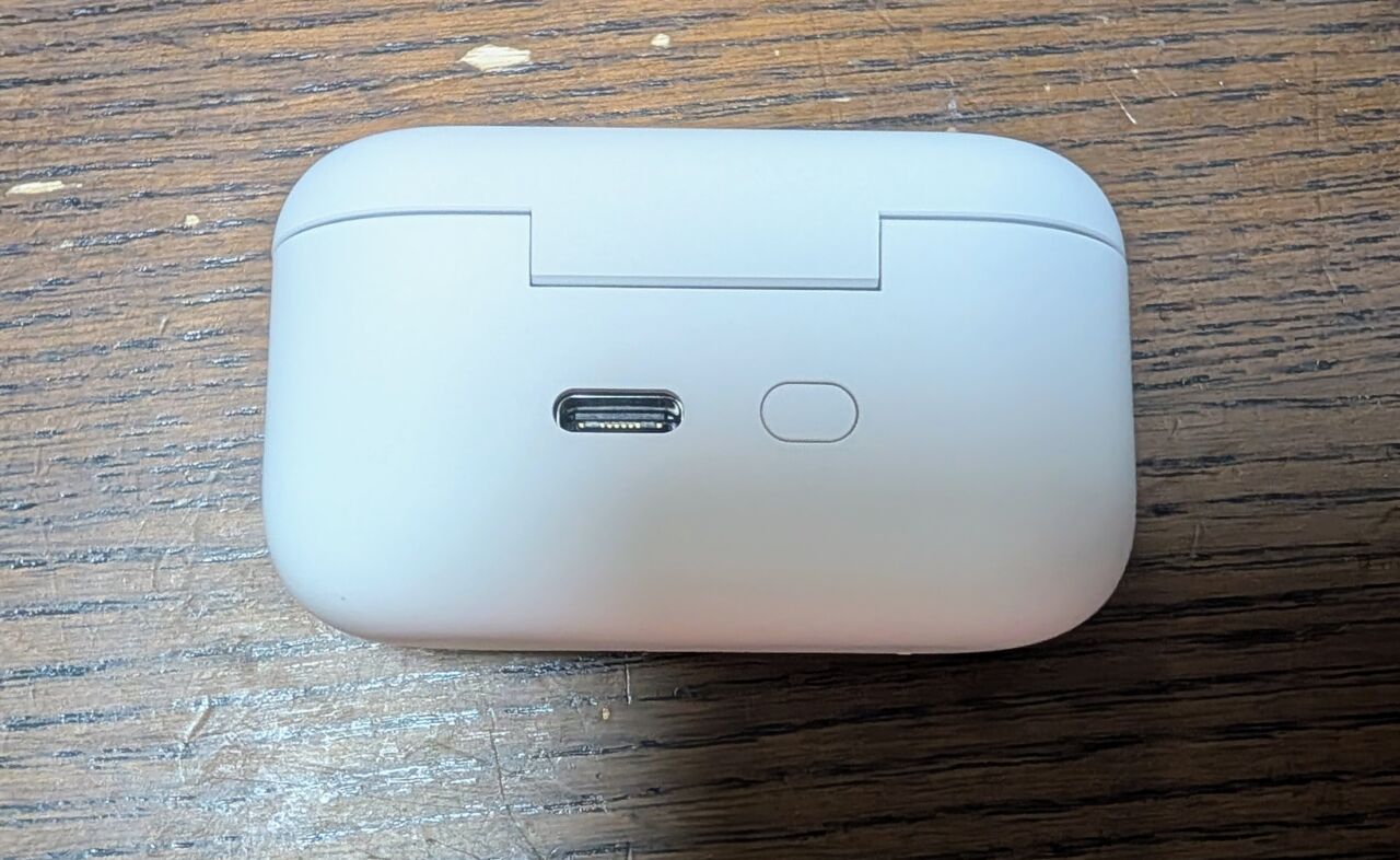 裏側は充電端子(USB TypeC)とボタンがあります。ボタンは2台目(マルチポイント対応)のペアリングで使い、1台目は蓋を開けるとペアリングモードに自動でなりました。