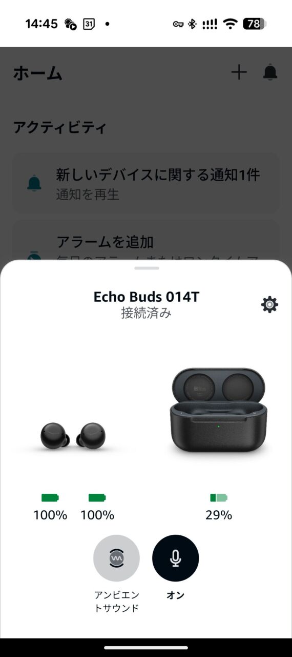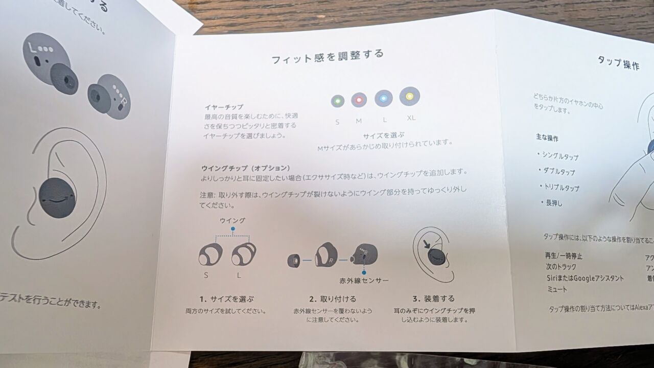 イヤフォンはAmazon Alexaアプリで確認・設定ができました。他のAlexaといっしょに管理できます。たくさんあるハードから選ぶの面倒でない?と思ってましたが、イヤフォン接続中は、アプリを起動すると自動で表示されました。初回?ペアリング時は使い方や、イヤーチップのサイズ調整ガイド?があって割と親切でした。