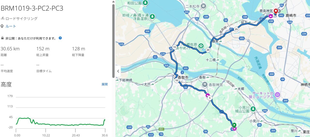 PC3の「ファミリーマート 鹿島神宮前店」を出発したら、PC4の「セブン-イレブン 柏松ヶ崎東店」までの70.3kmです。とおっ。