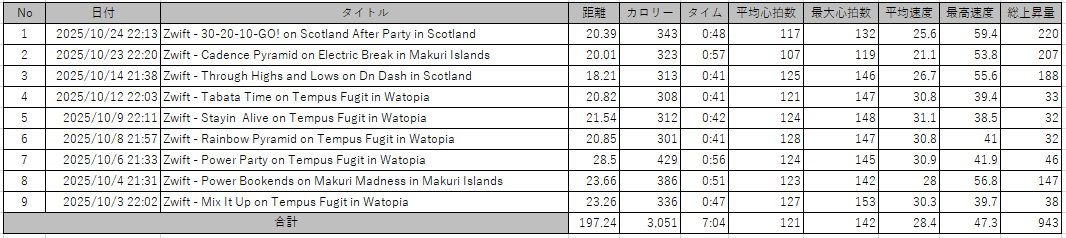 ZWIFTは先月の11回よりも更に少なく9回で197.24kmで、獲得高度が943mでした。