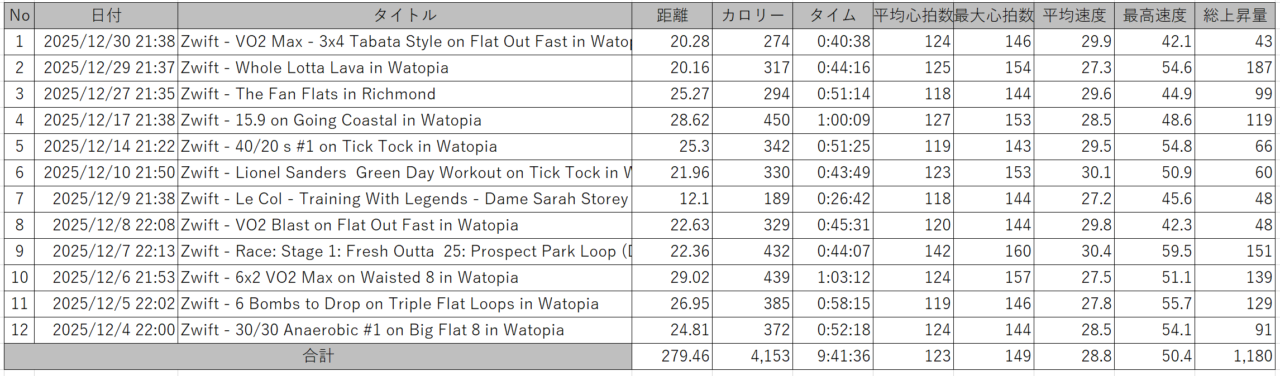 ZWIFTは先月の16回より減って増えて12回で279.46kmで、獲得高度が1,180mでした。