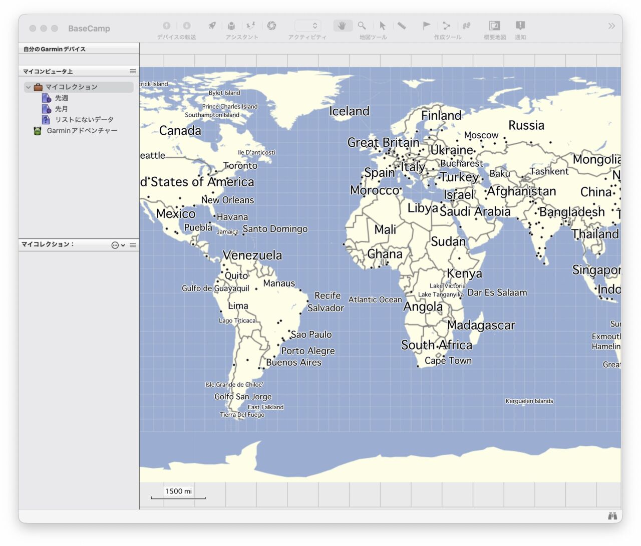初期状態のBaseCampだと、洗い地図が入っていて、地名ぐらいはある程度分かりそうですが、道路は全然な感じに見えます。で、よくよく考えてみたら、BootCampに地図が入っていなくても、困らないですね。。大まかにどのルートを入れたかがわかれば良いので、詳細地図がなくても大丈夫です。