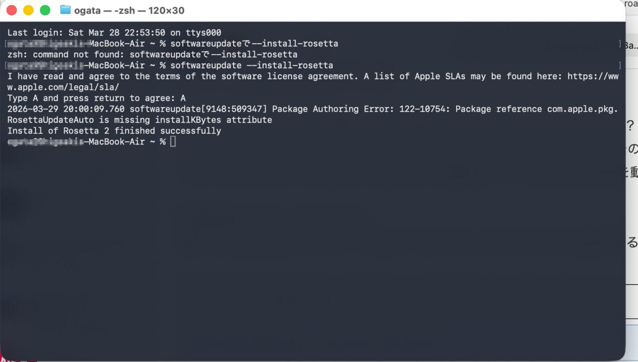 softwareupdate --install-rosetta入ったかな?