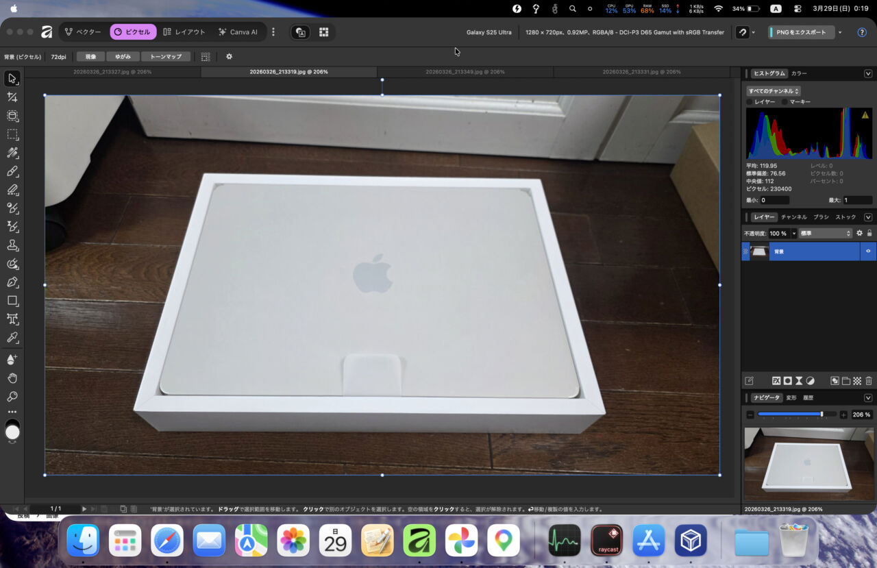 って事で、フリーで使える物で最初はGIMPを使いましたが、Affinityというアプリが使いやすかったです。Photoshopっぽい感じで覚えやすそうです。