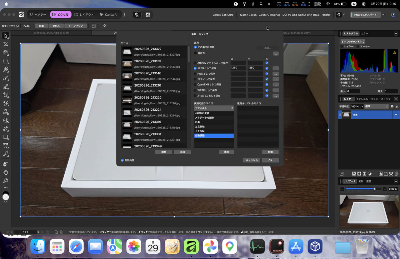 あと、画像の一括変換もできるので。良かったです。いつも使っている画像の自動補正はマクロを作って処理しました。LightRoomにもありそうですが、使ってなかったです。。(^_^;