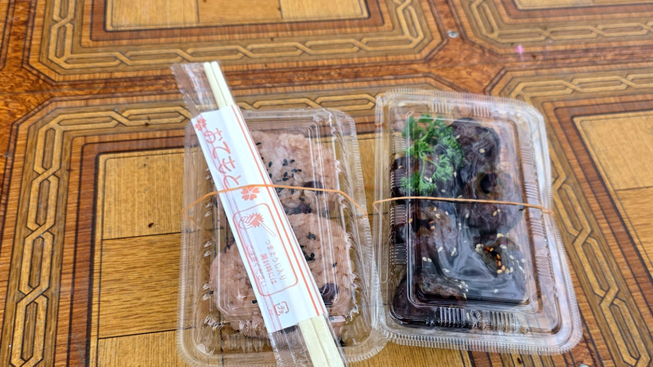 赤飯のおにぎりと、肉団子を頂きました。1個300円でした。やすっ。