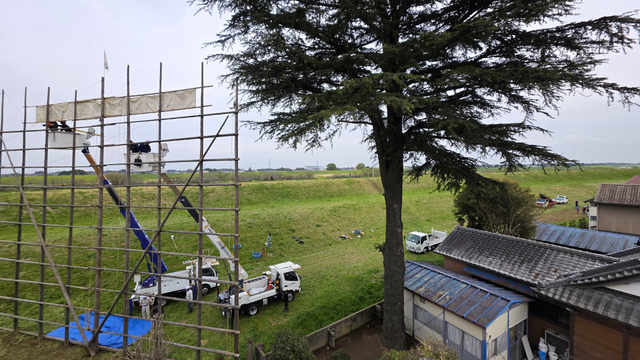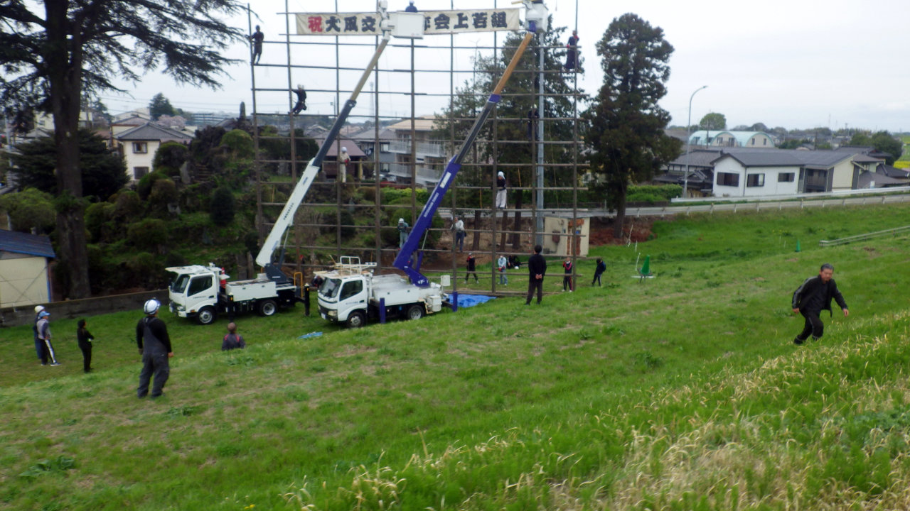 この先で、クレーンを使って凧を作ってました。飛ばすのかな?