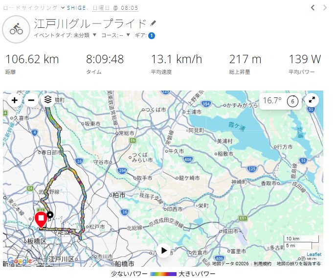 段々向かい風が強くなってきて極端にスピードが落ち込みましたが、往路で必死に漕いだからか(それでもみるみるうちに皆さんとの距離が開いていく)、最終的な平均スピードは普段より速くてびっくりです。