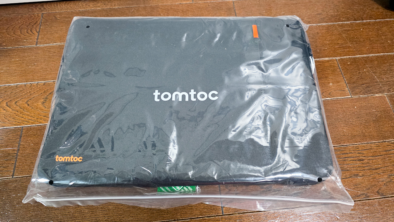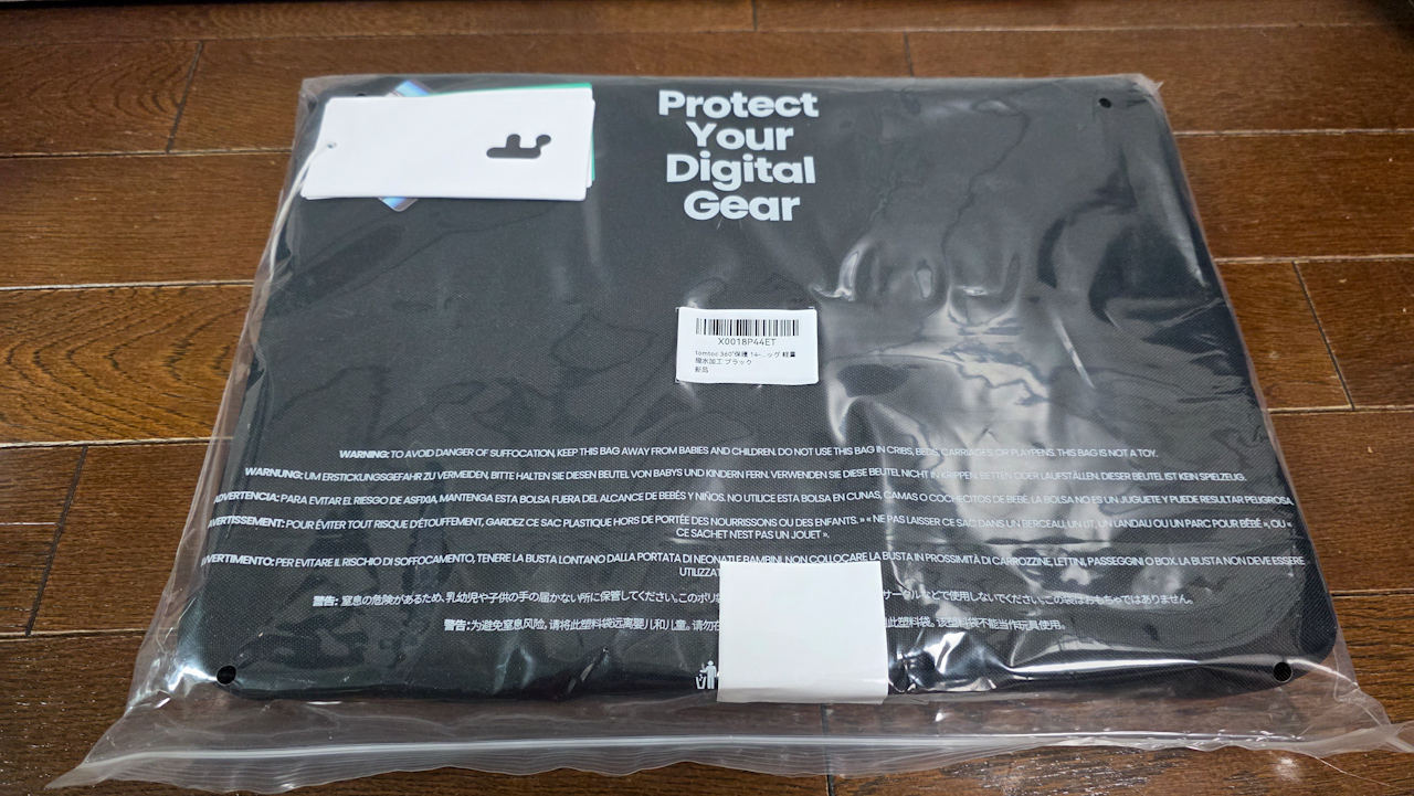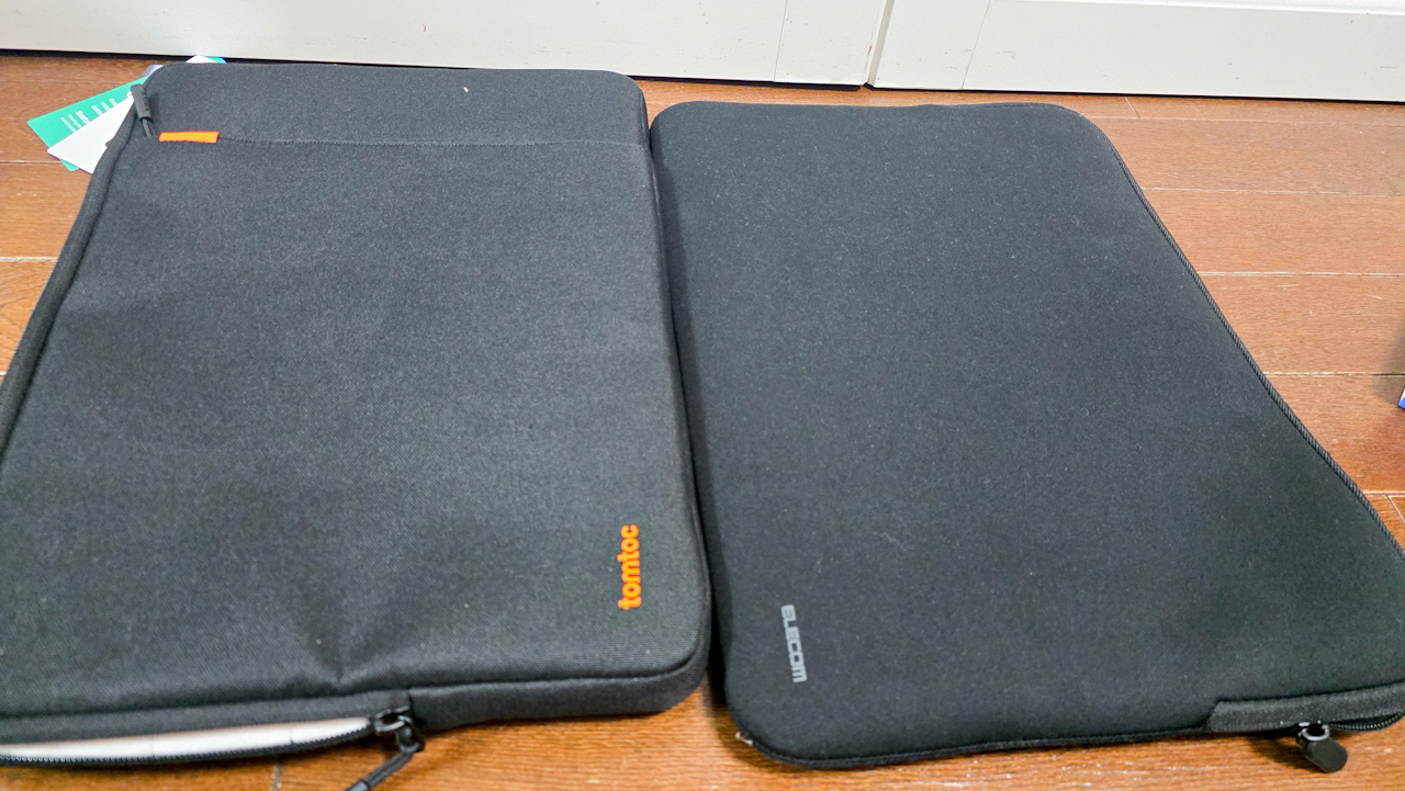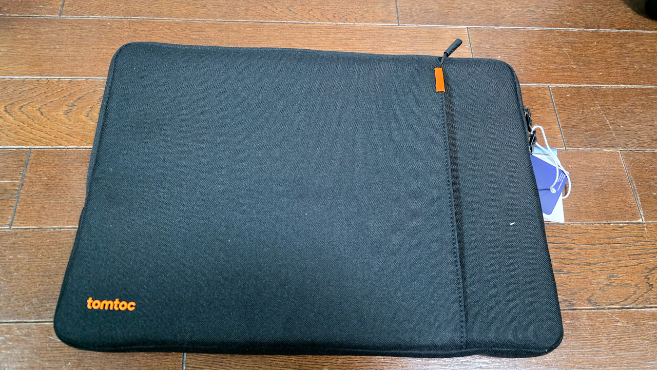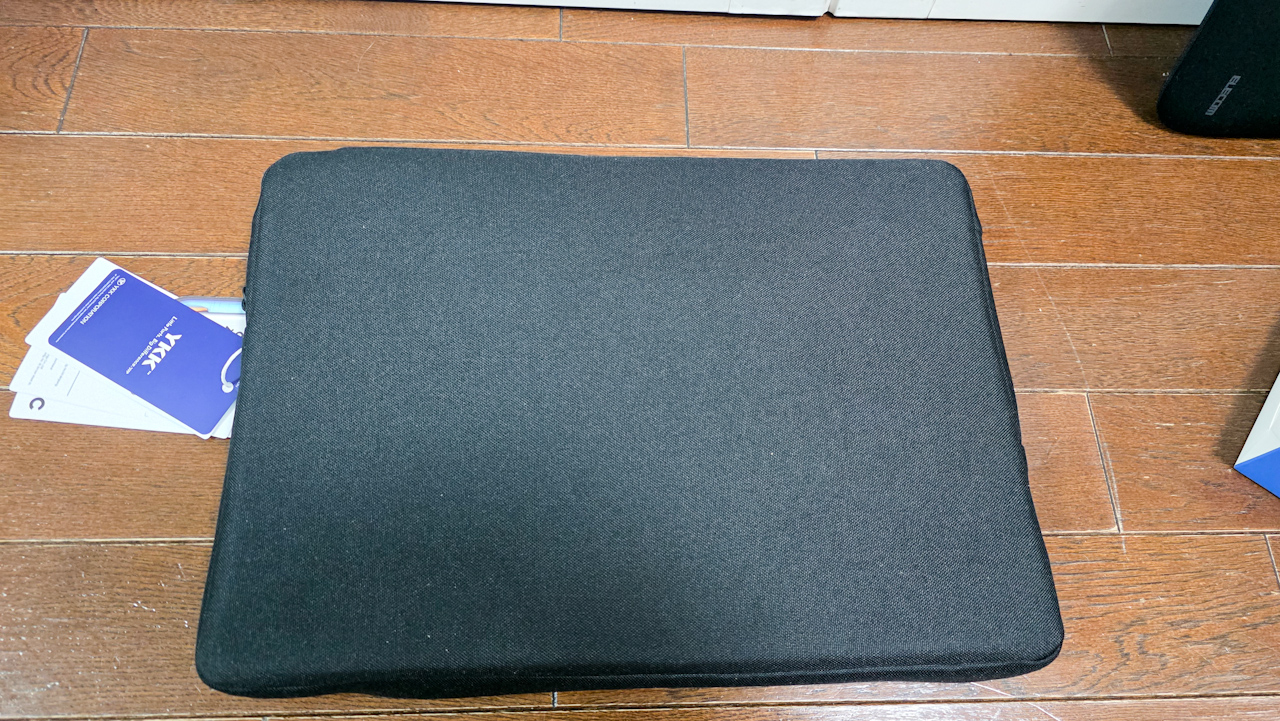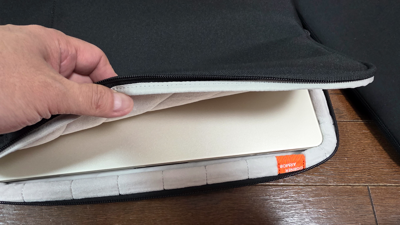 新しい方に入れてみます。カバーが付いてるので、ピチピチかも?と気になっていましたが、ぴったりフィットでした。なかなか良い感じです。当たり前ですが、MacBookを入れた状態だと結構な厚みです。その分クッション性が高そうです。