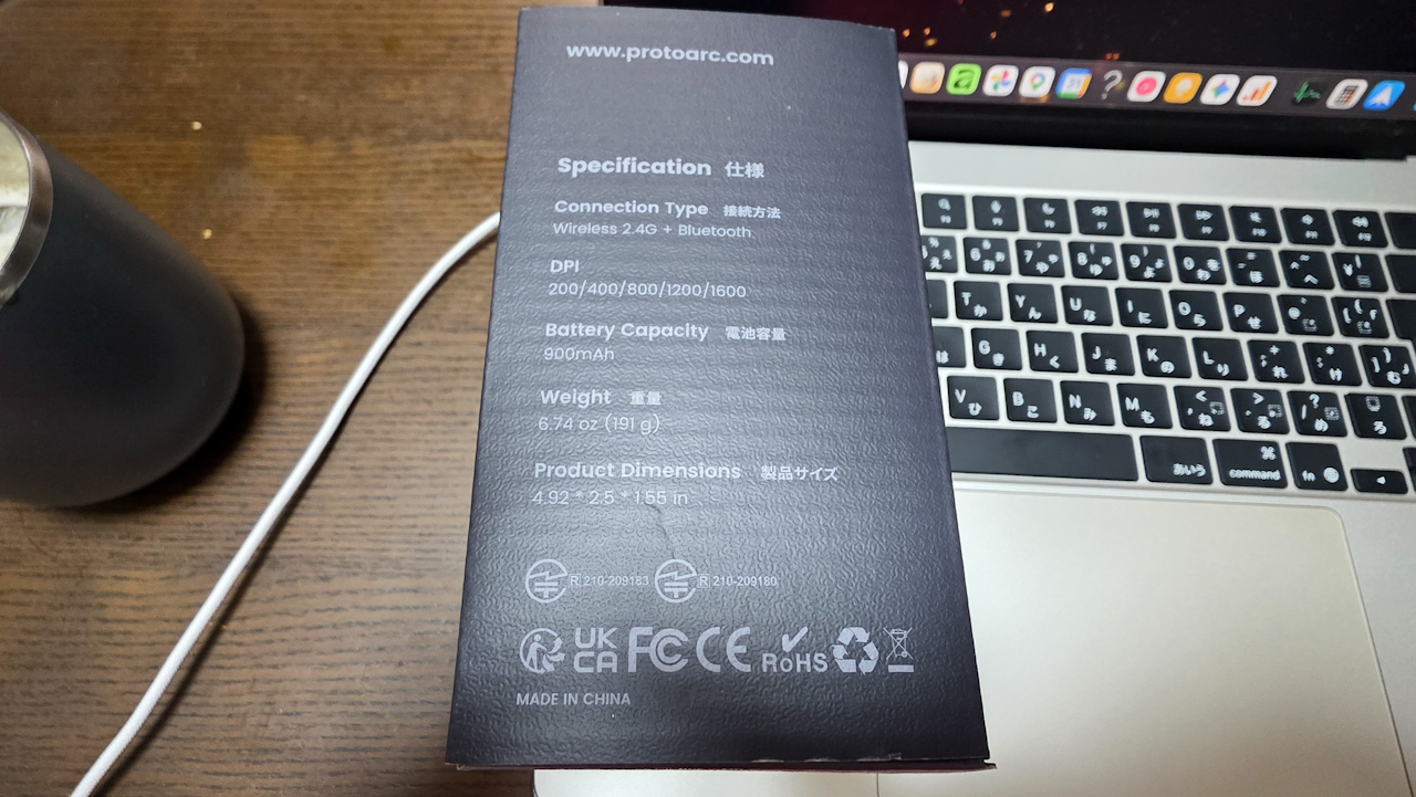 接続はUSBアダプターかBluetoothです。DPIは切り替え可能で。バッテリーは900mAhです。