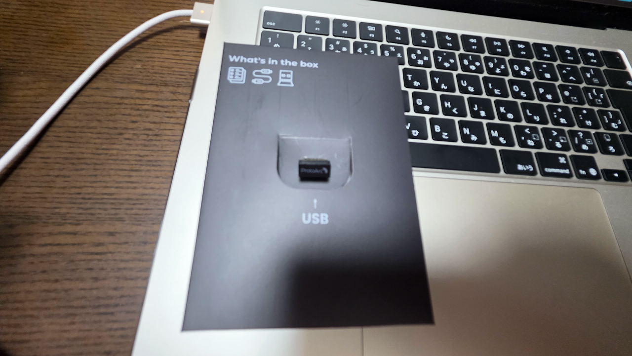 開けてみると、USBアダプタがついています。多分使わないと思う。。