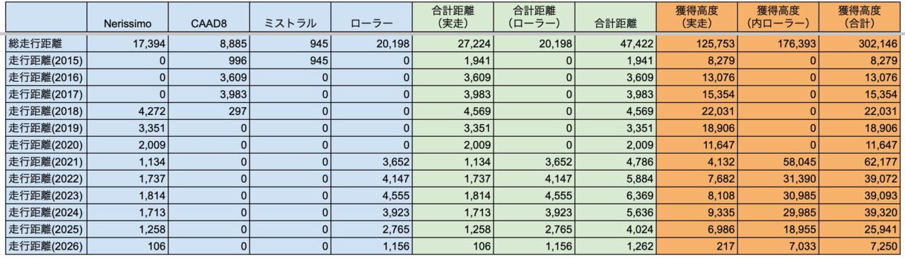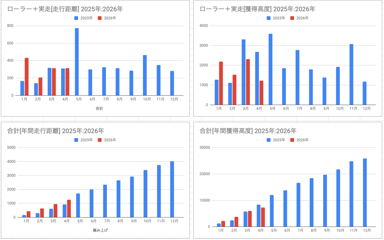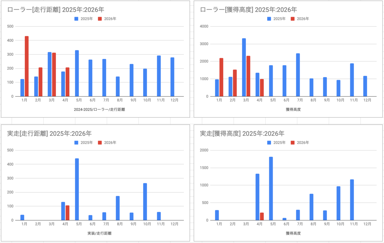 ZWIFTは昨年と同じぐらいかな?走行距離が少し長くて、獲得高度が低い感じです。