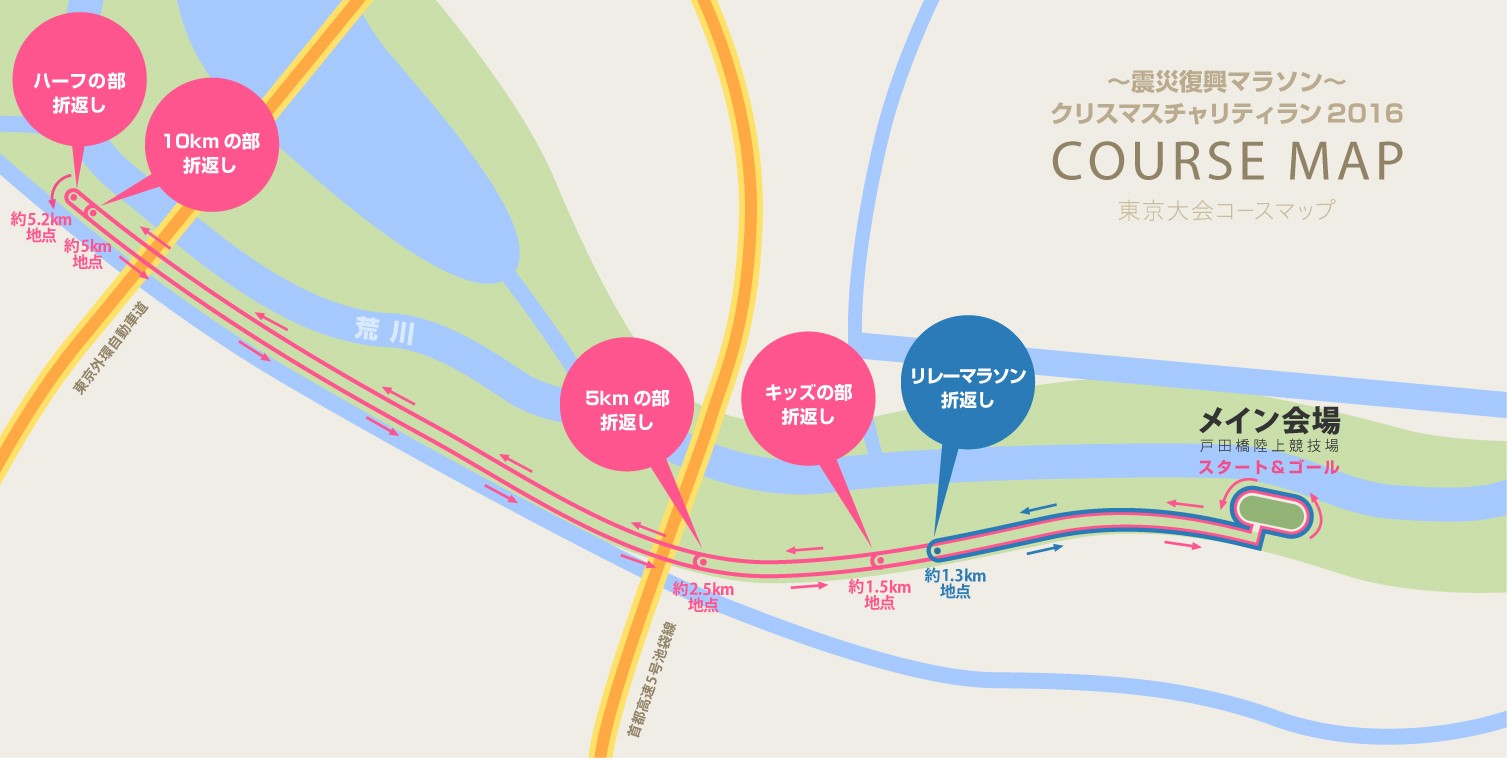 | 12/10(土) | 【右岸】 荒川戸田橋陸上競技場-荒川河川敷運動公園 | ~震災復興マラソン~クリスマスチャリティラン 2016 東京大会 | 大会ページ |
